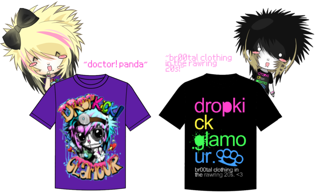dropkick! glamour is a 2000s styled clothing line from Melbourne, Australia. initially inspired heavily by oli sykes’s dropdead! clothing. graphic designs also take elements from other brands like cupcake cult, killer panda, babycakes, sosohappy monsters etc etc. ran by kasper, determined to revive the scene. p.s. sizes for starter stock may not be as diverse sorry!